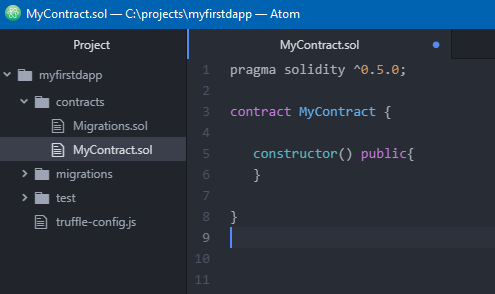 10. Now save the file (in most editors is shortcut keys “Ctrl + s”). You now have the minimum code for a contract. To compile the contract return to the Command Prompt window and type:
