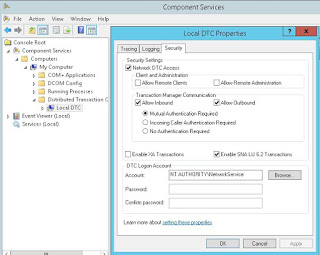 On your client computer use the same above procedure to open the “Security Configuration” setting, make sure you check “Network DTC Access”, “Allow Inbound/Outbound” option, restart service and computer if necessary.
